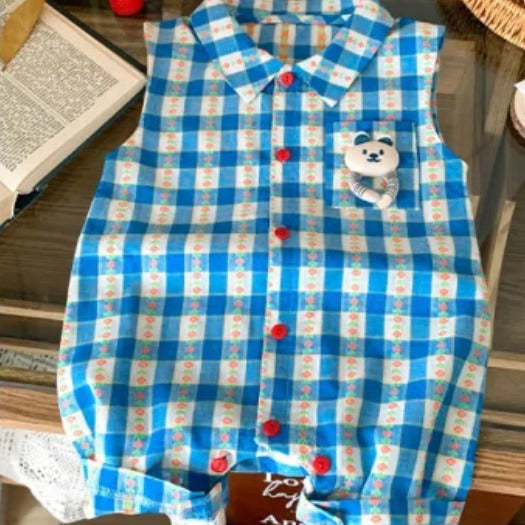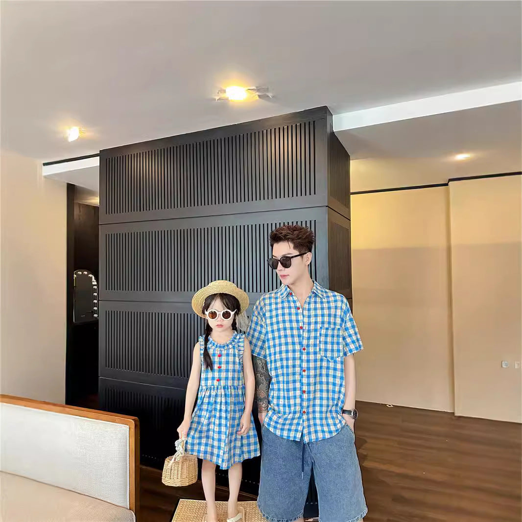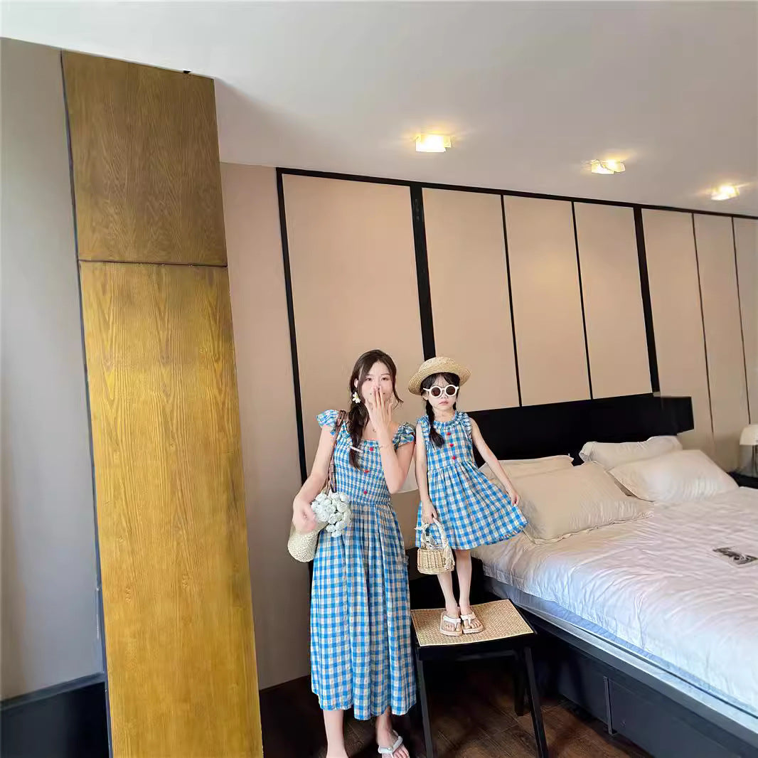 L25041701韓系親子裝連身裙夏裝格紋背心親子裝一家四口母女海邊度假連身裙