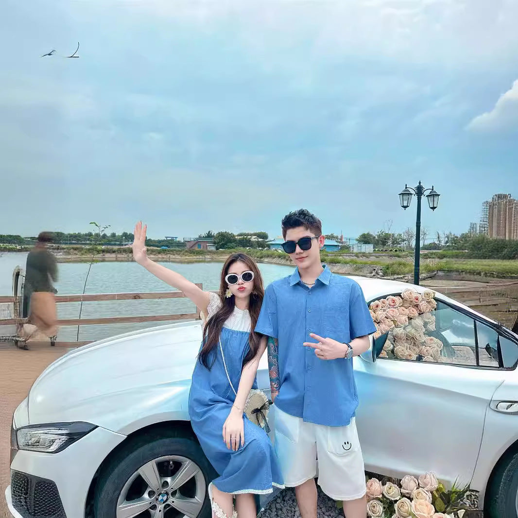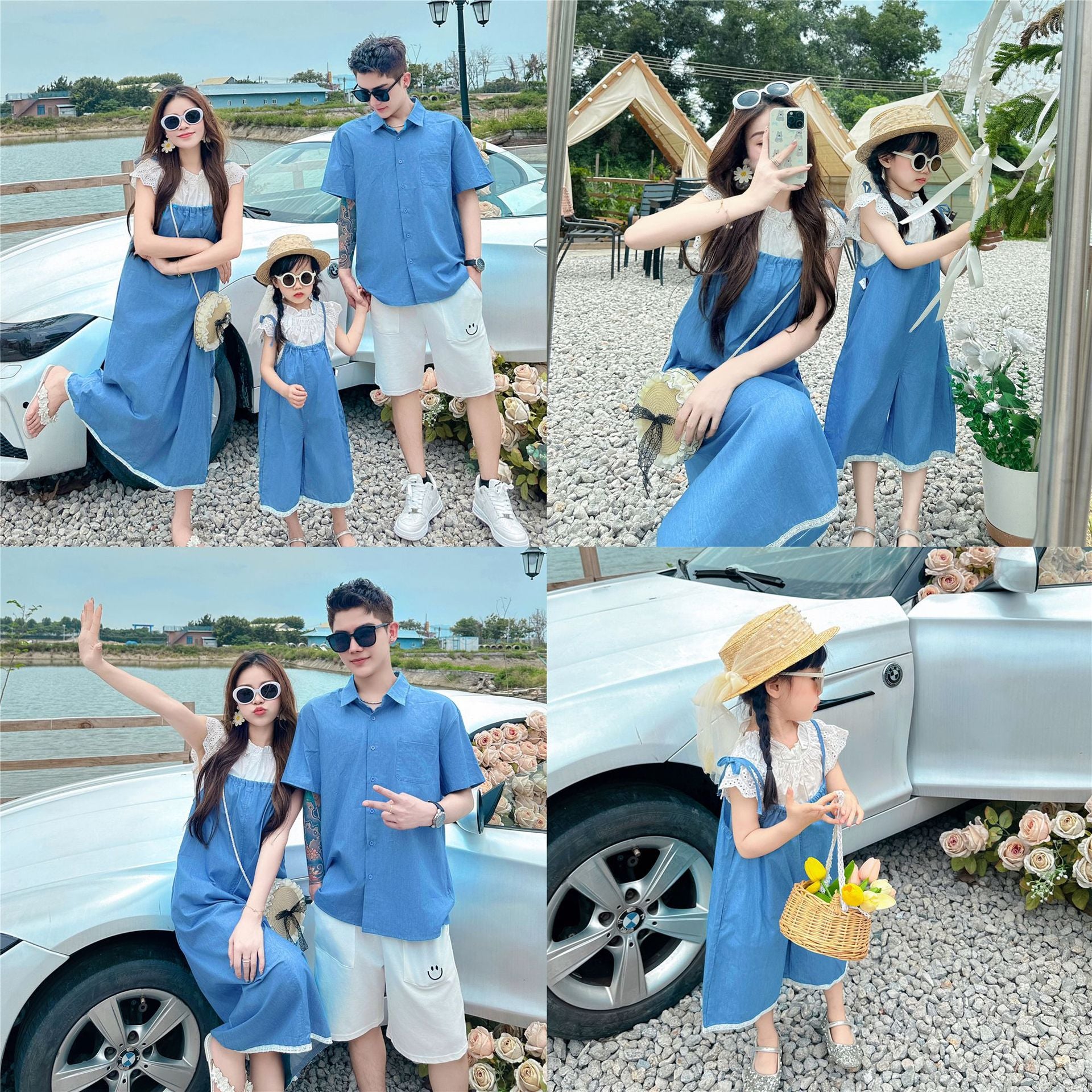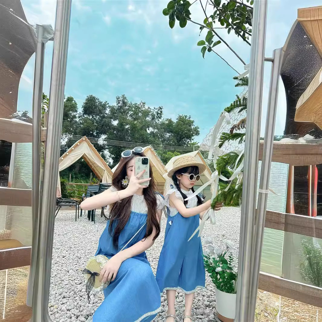 L25041710韓國童裝2025夏季親子裝母女牛仔吊帶褲女童洋氣娃娃領父子polo衫