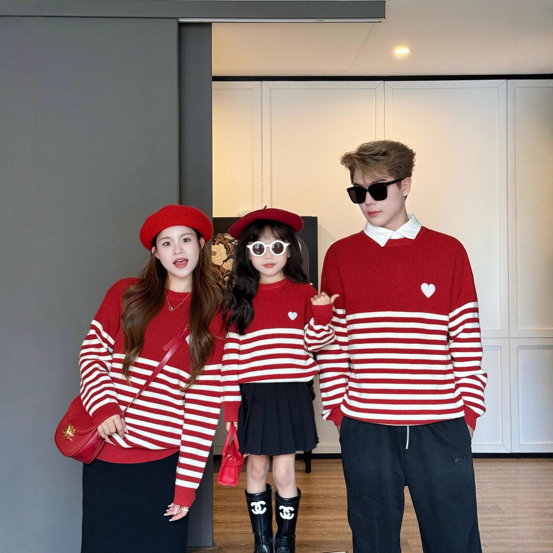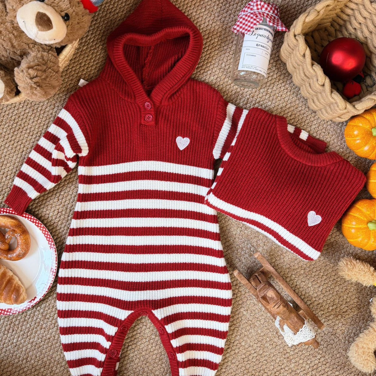 L26010607小月齡親子裝新生兒爬服愛心針織衫童裝三口秋冬裝紅色條紋毛衣
