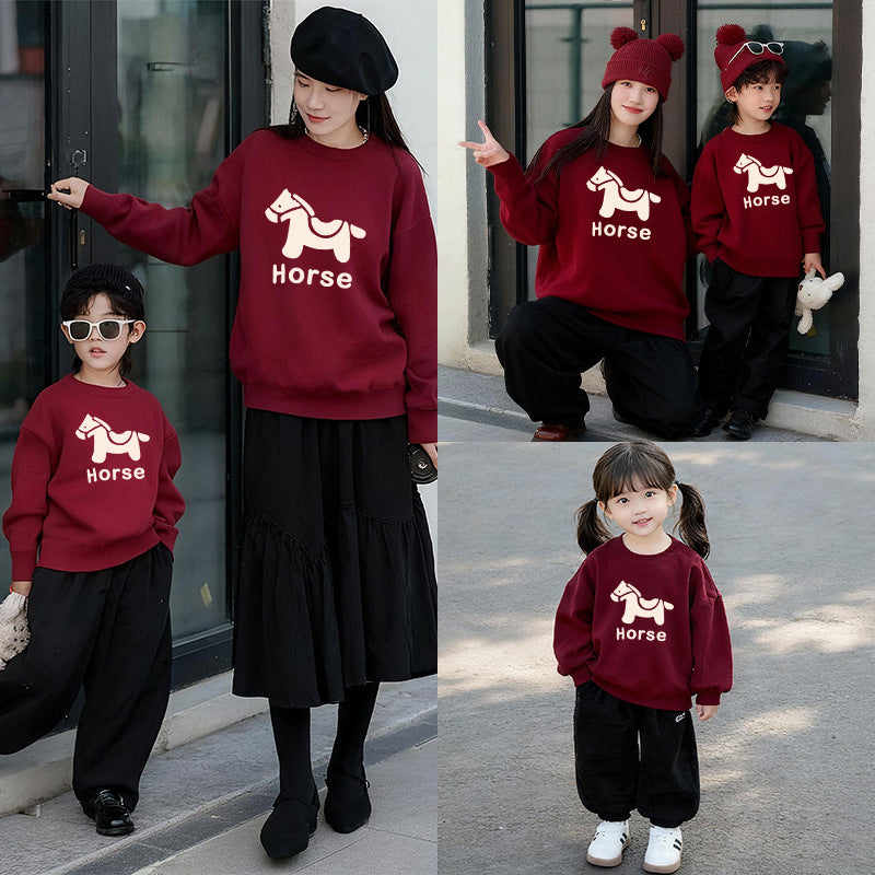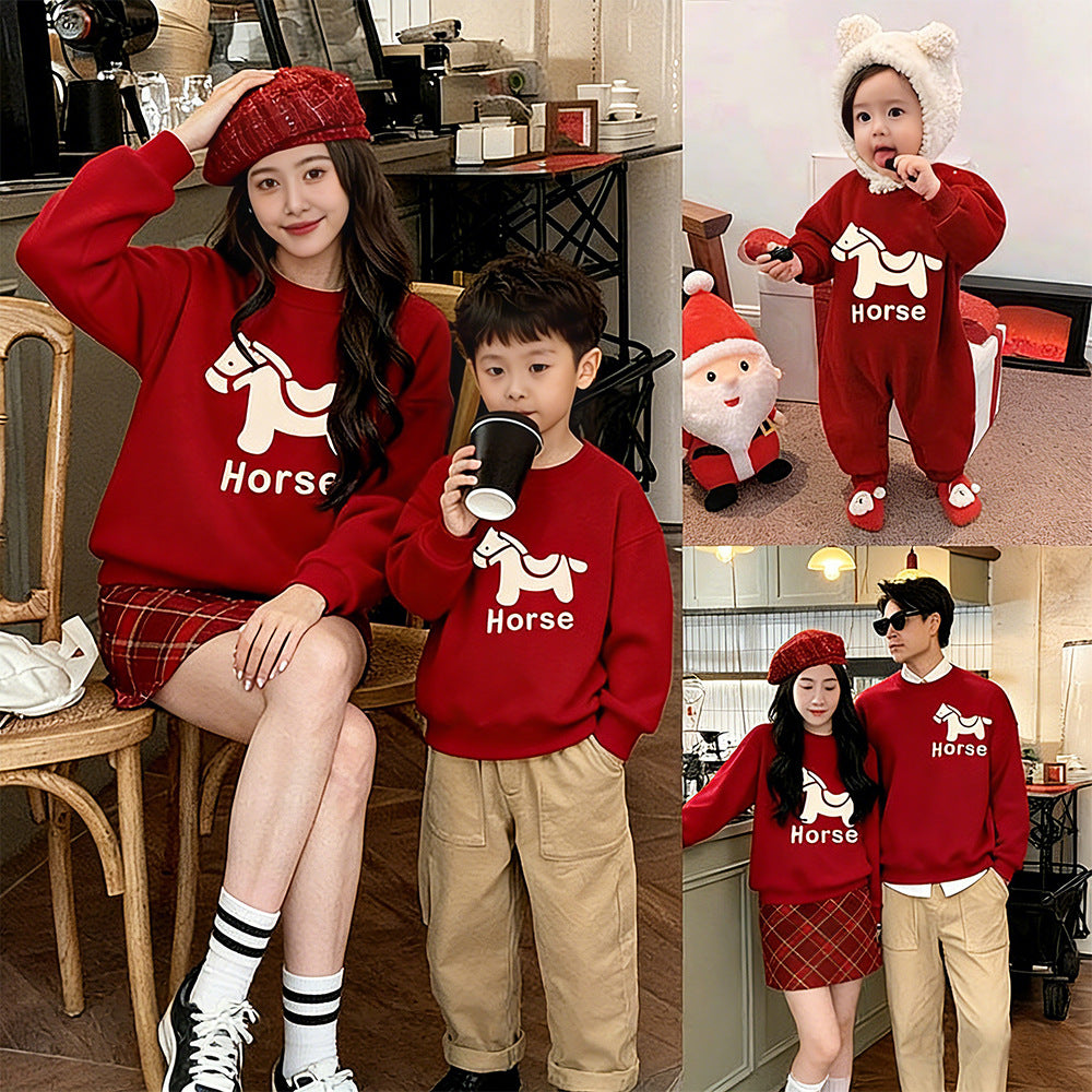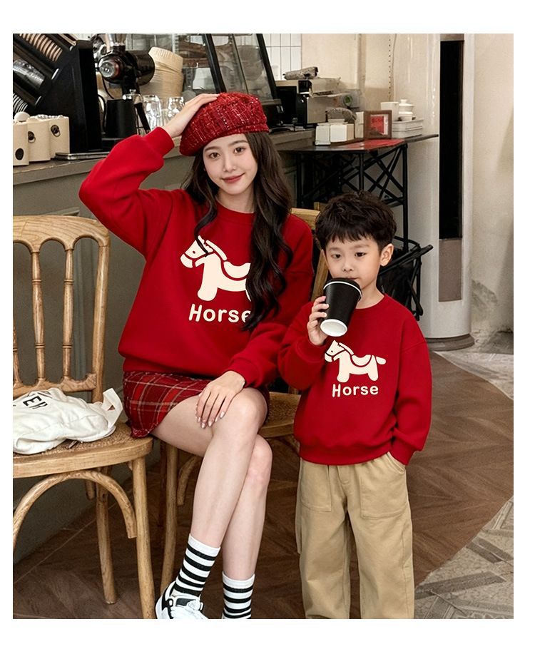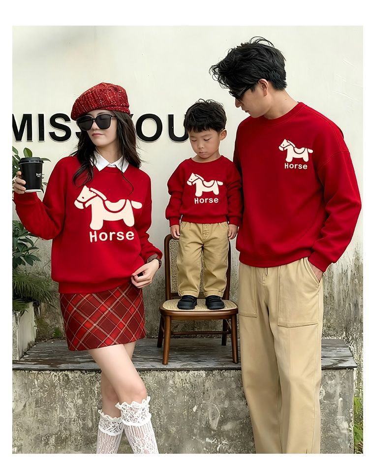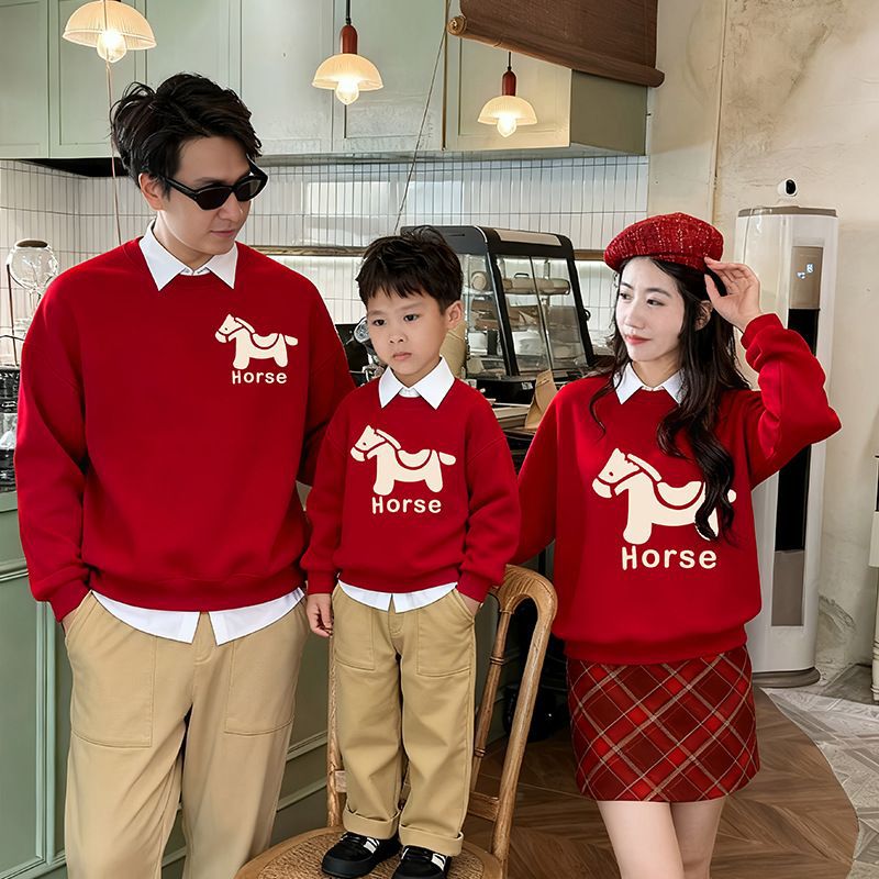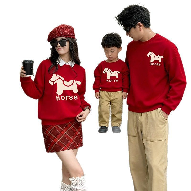 LA26011401親子裝秋冬新款圓領印花衛衣一家三口高端全家裝紅色喜慶拜年服潮