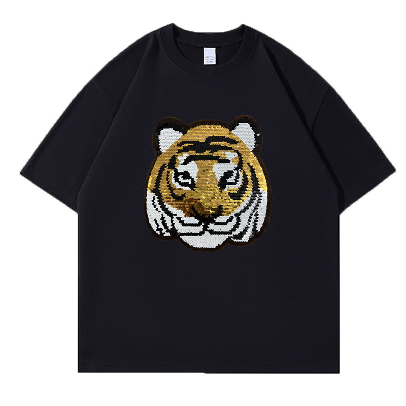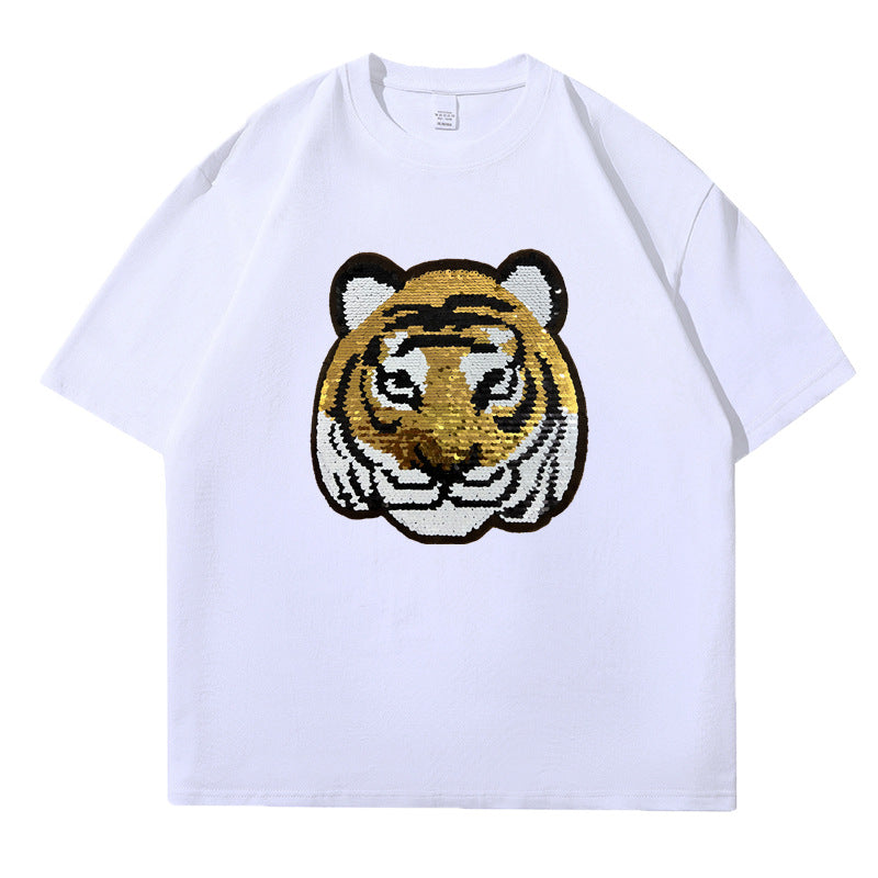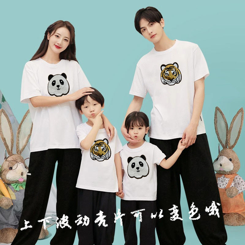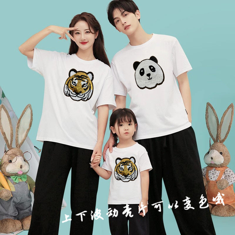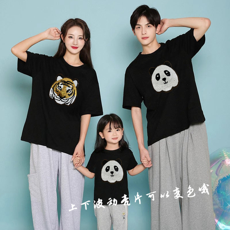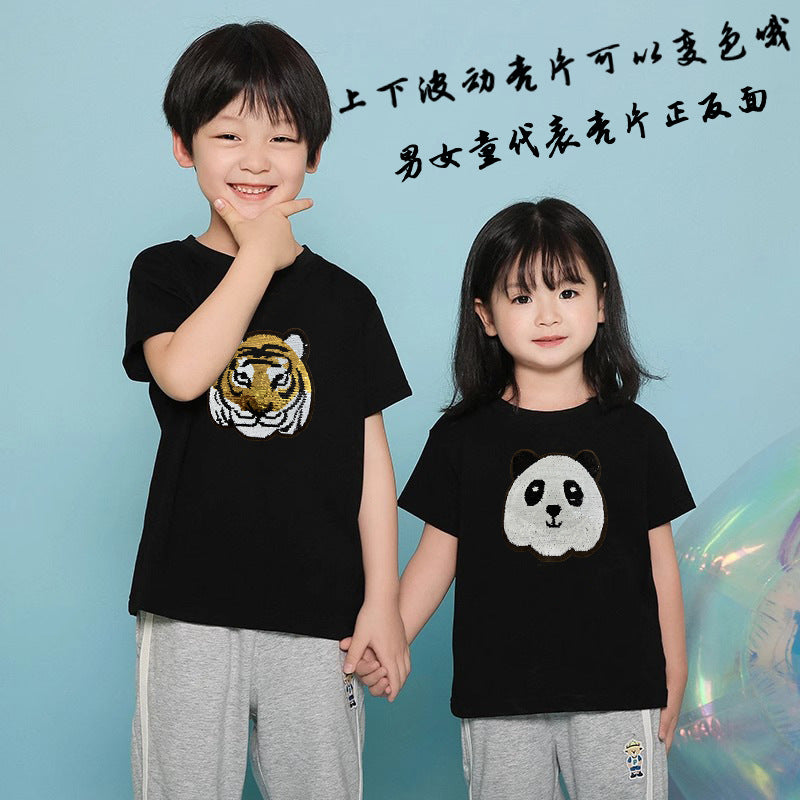 Z24032330老虎變熊貓趣味亮片T恤親子裝夏季時尚男童裝大眾休閒兒童上衣