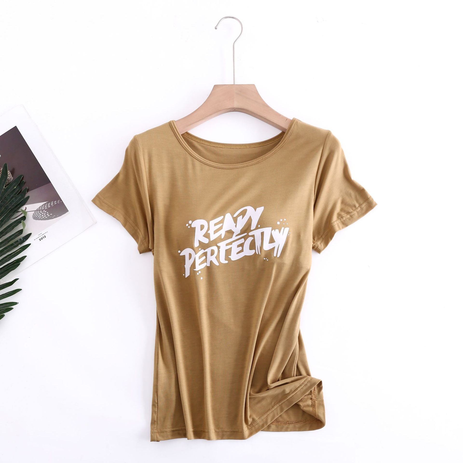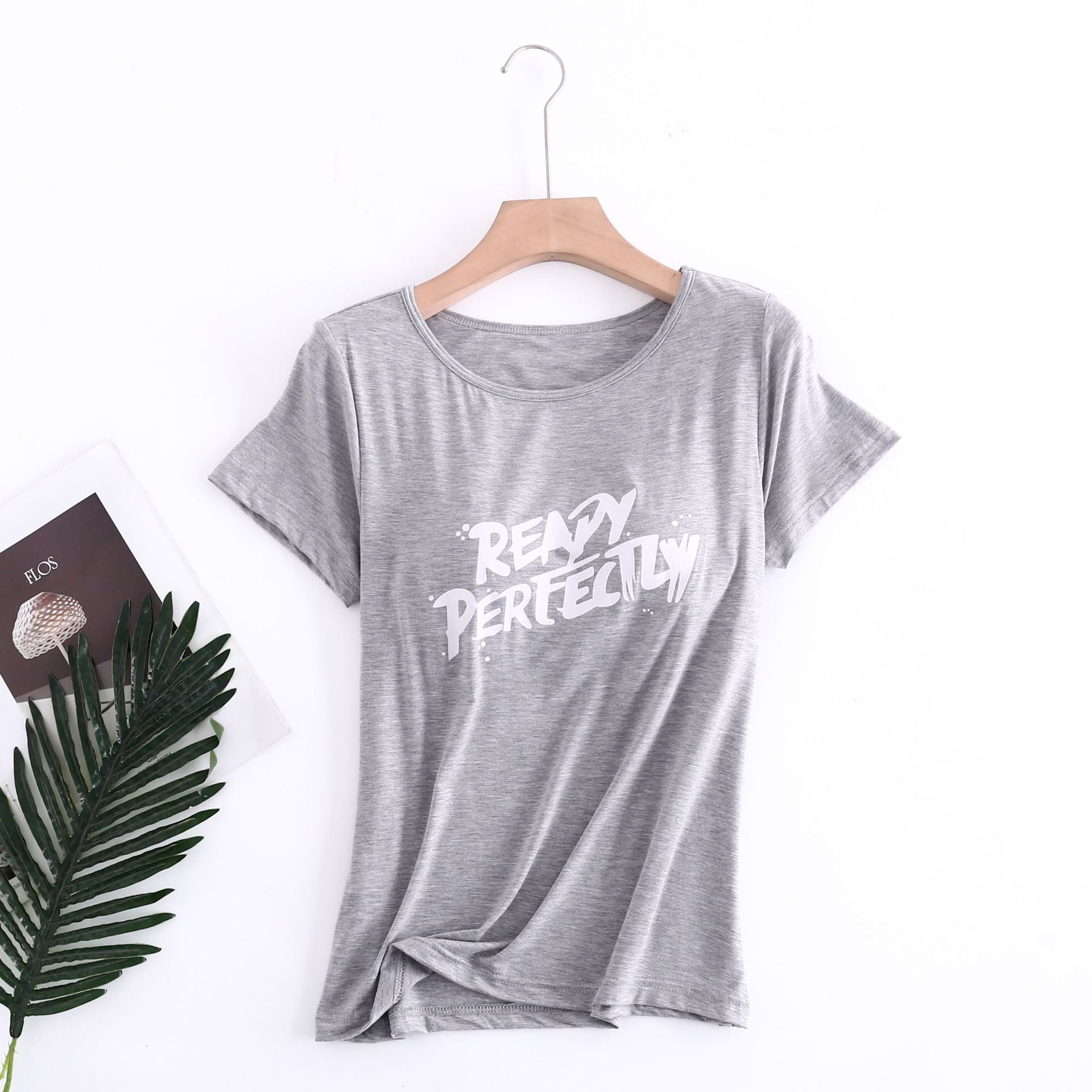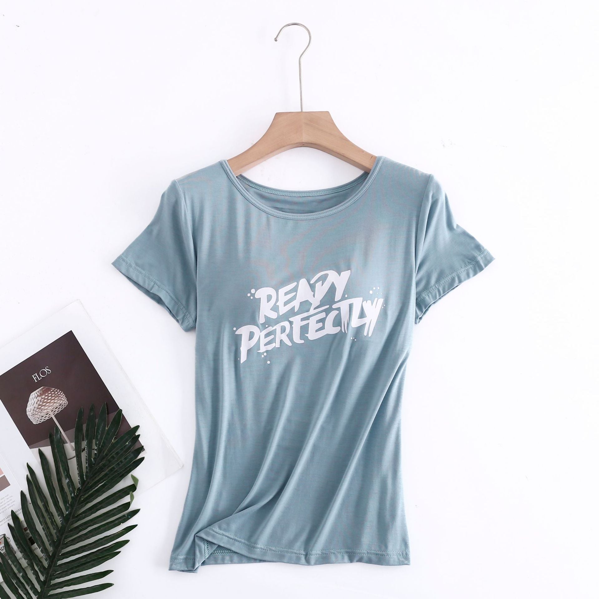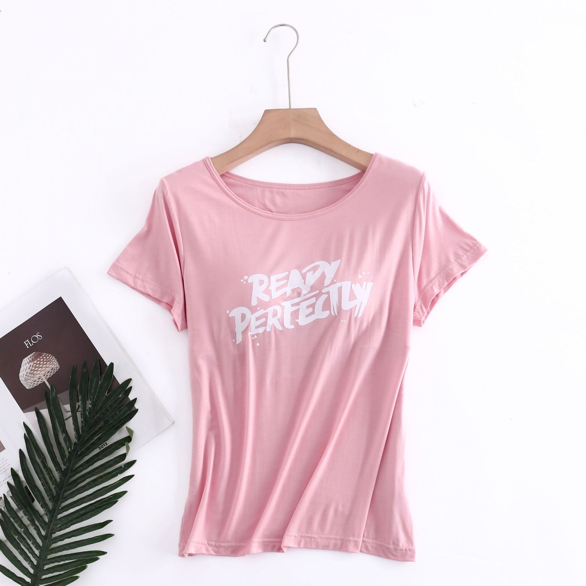 Z24070209莫代爾印花短袖女用胸墊無鋼圈大眾版短袖bra-t罩杯連身式半袖