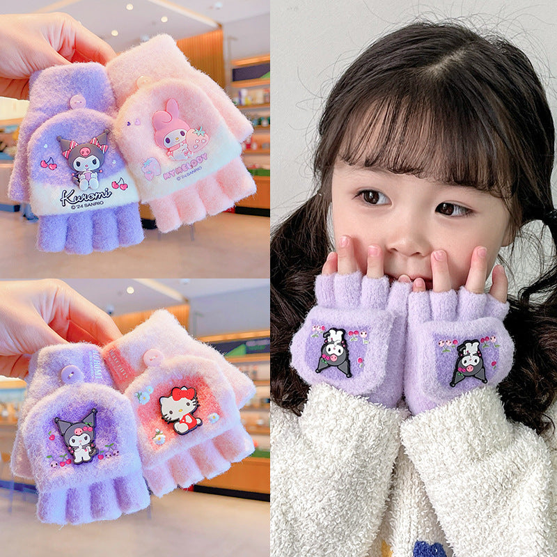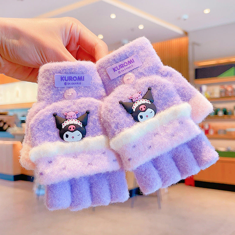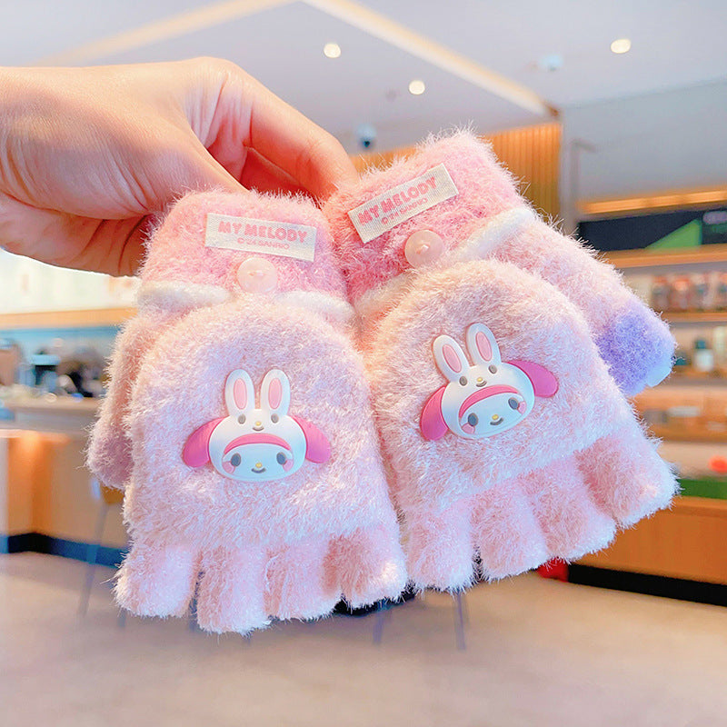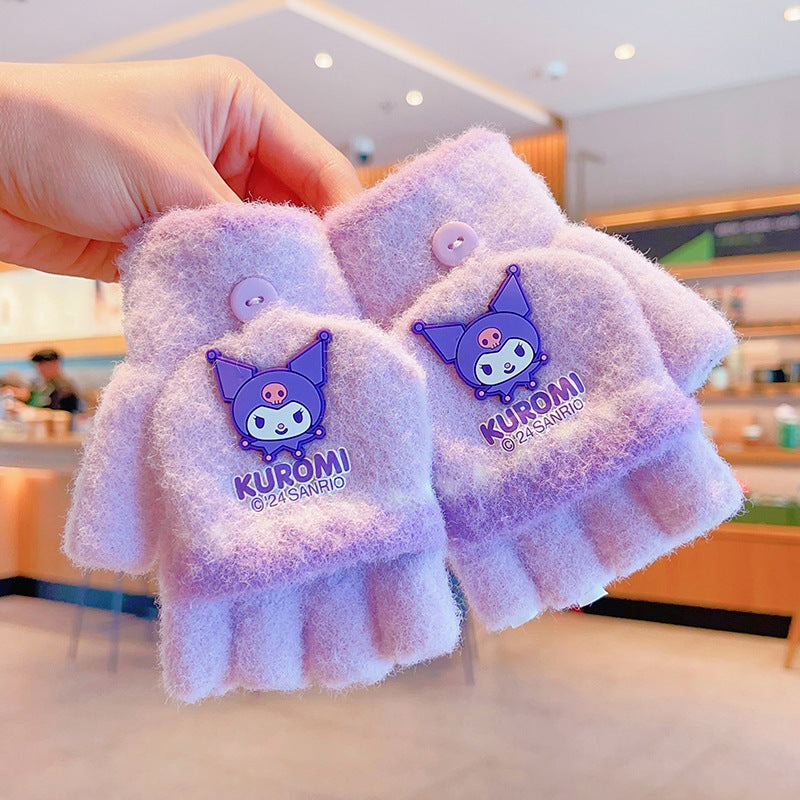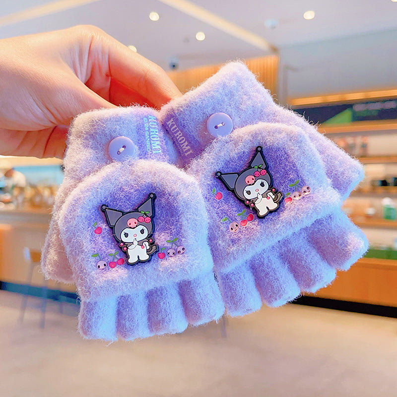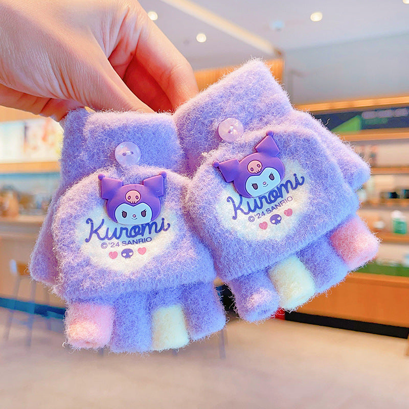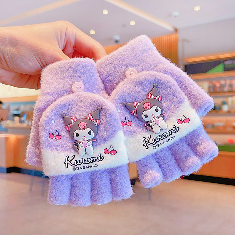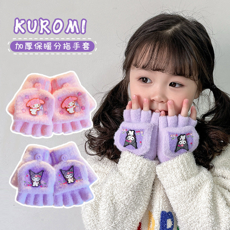 Z24120108庫洛米兒童翻蓋手套秋冬季可愛卡通加絨五指套女童防風保暖連指套