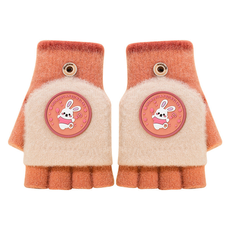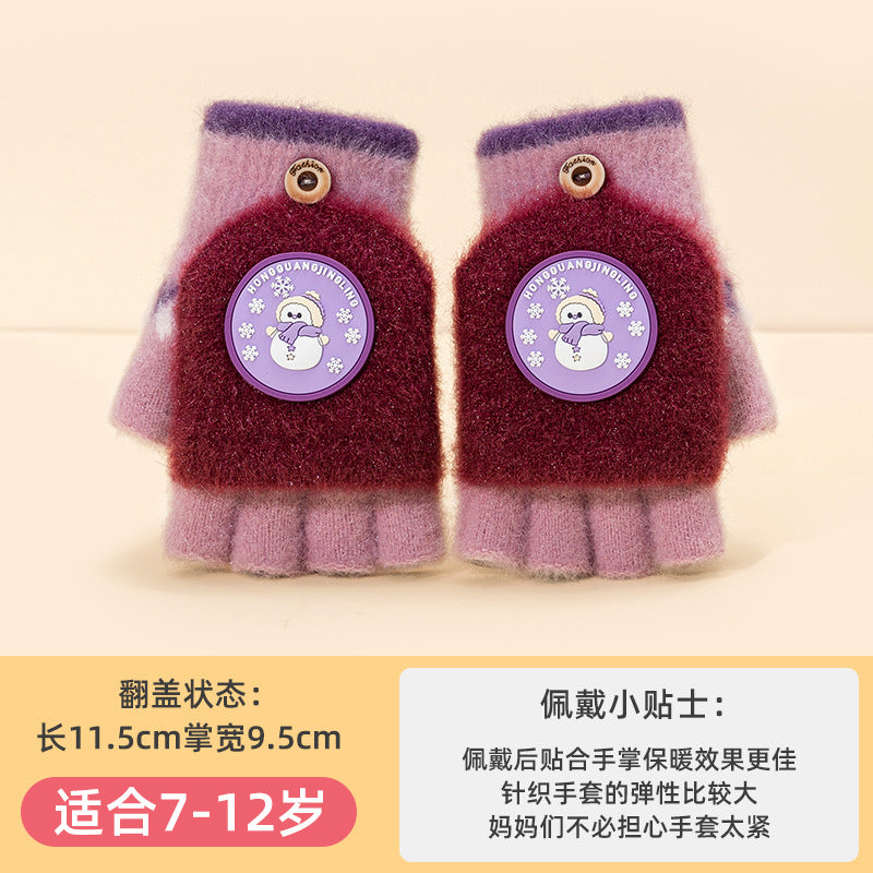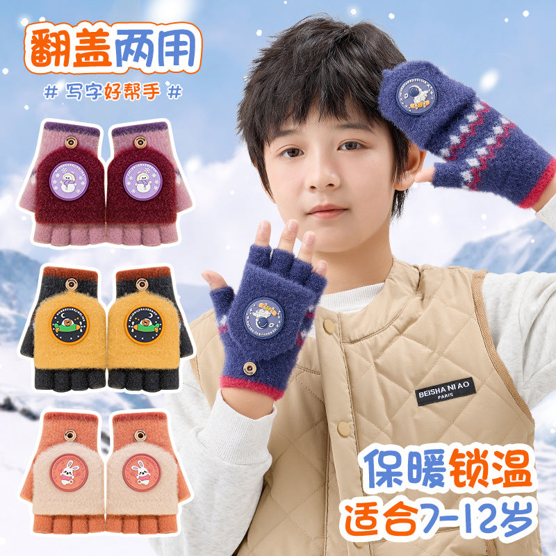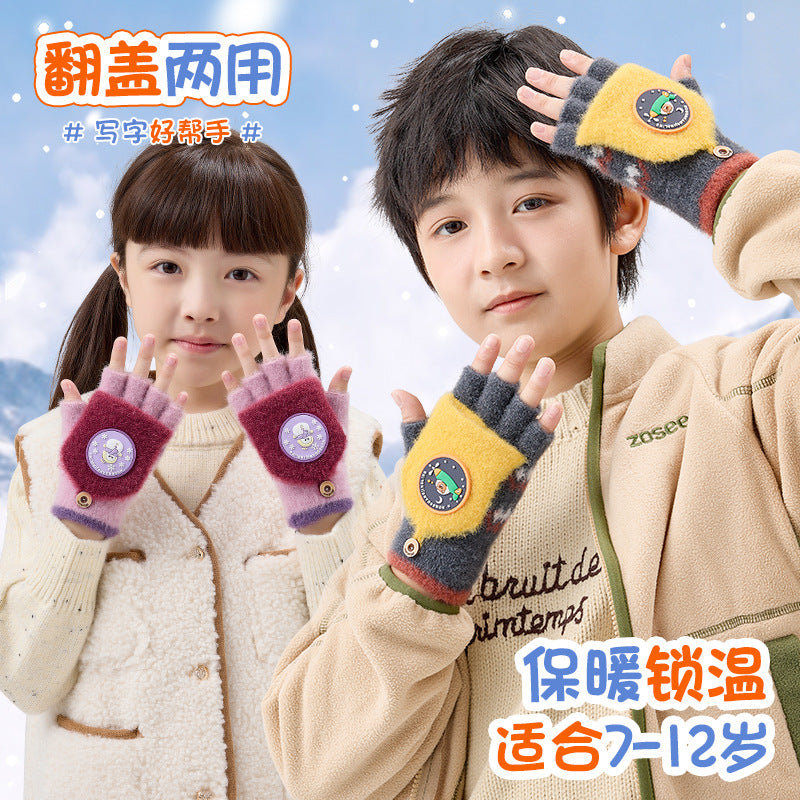 Z24120109冬季保暖男童女童針織卡通小學生半指寫字不凍手翻蓋手套兒童7-12