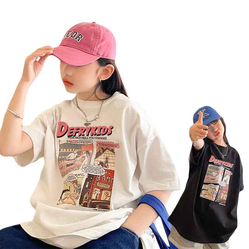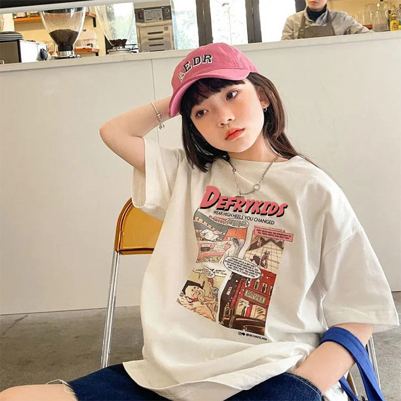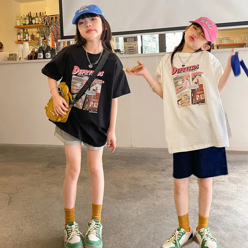 Z25030426女童短袖純棉洋氣兒童t恤女童夏季寬鬆前後印花短袖上衣童裝潮