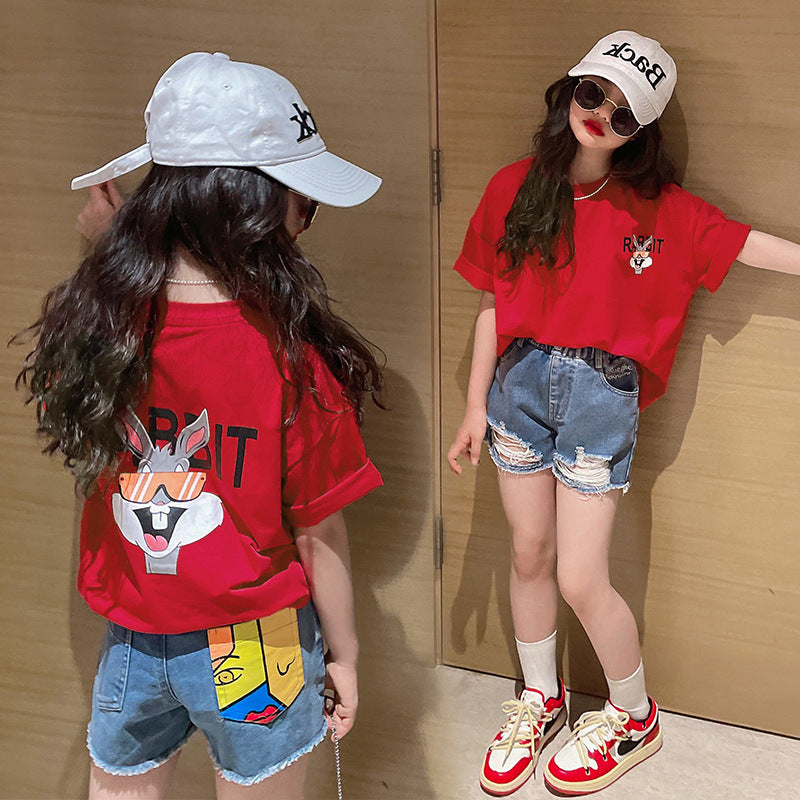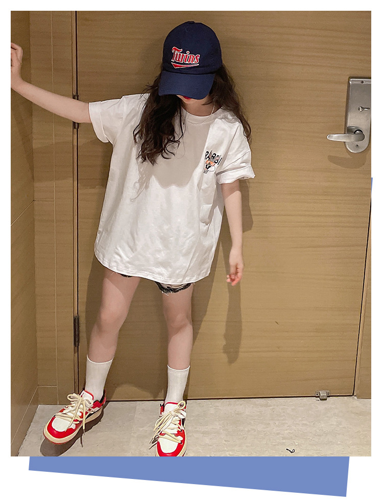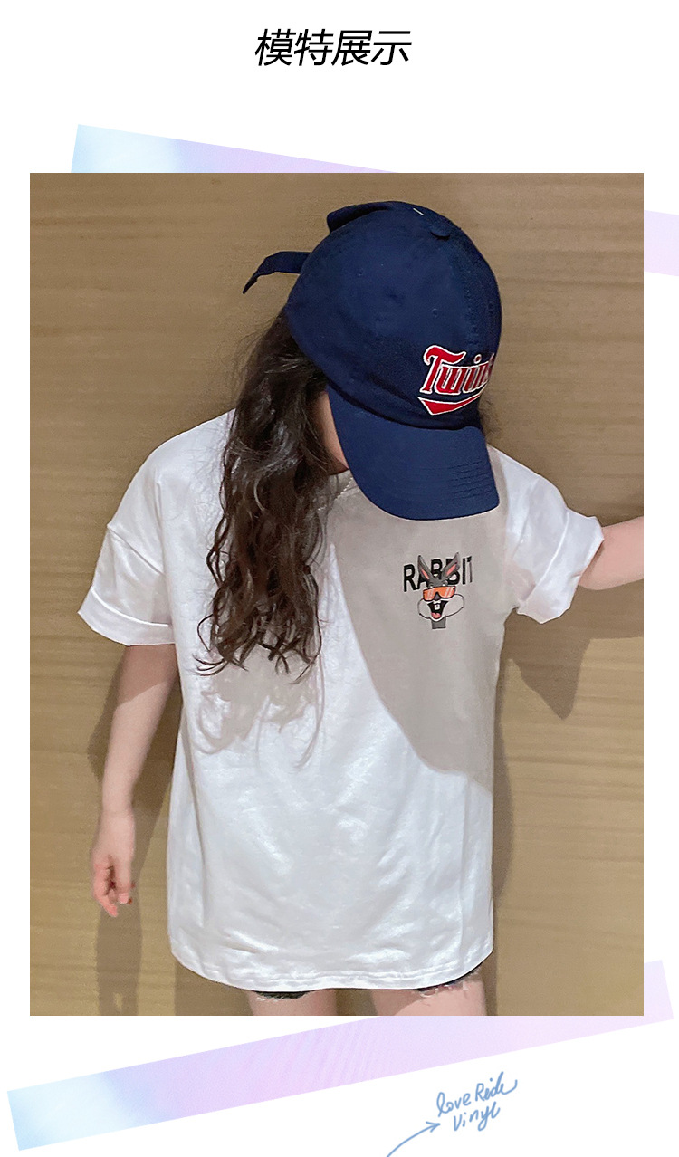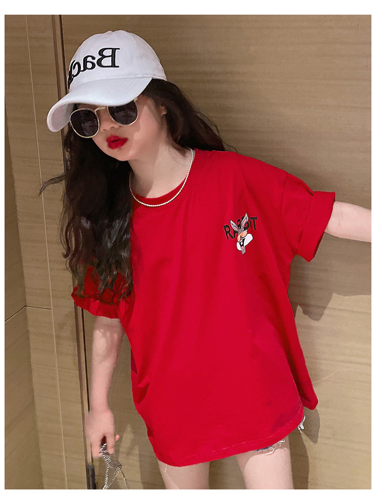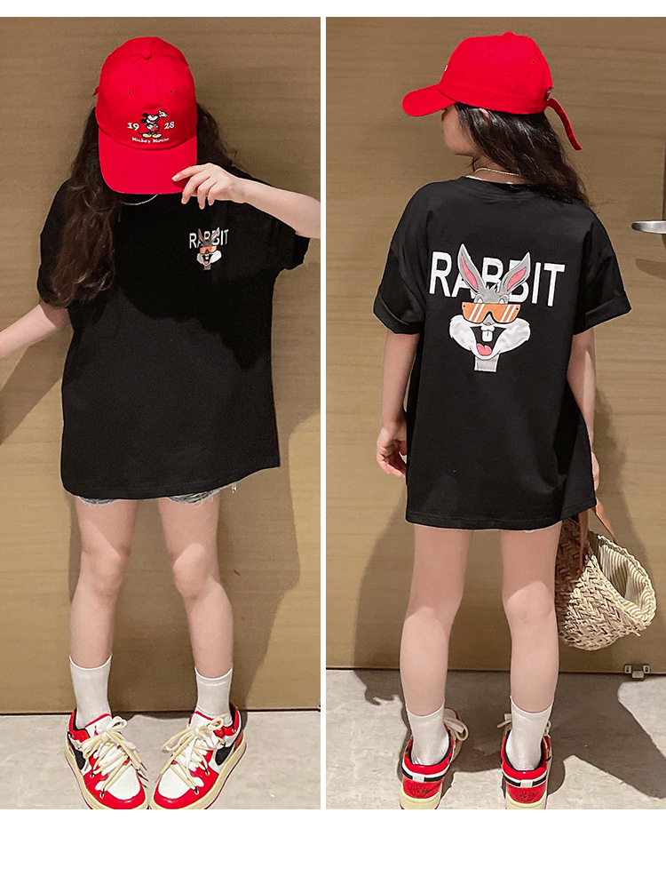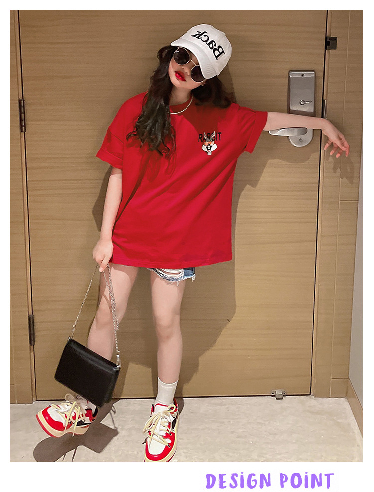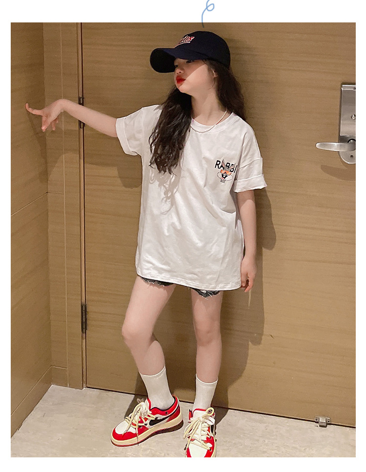 Z25030428女童短袖純棉洋氣兒童t恤女童夏季寬鬆前後印花半袖上衣童裝潮