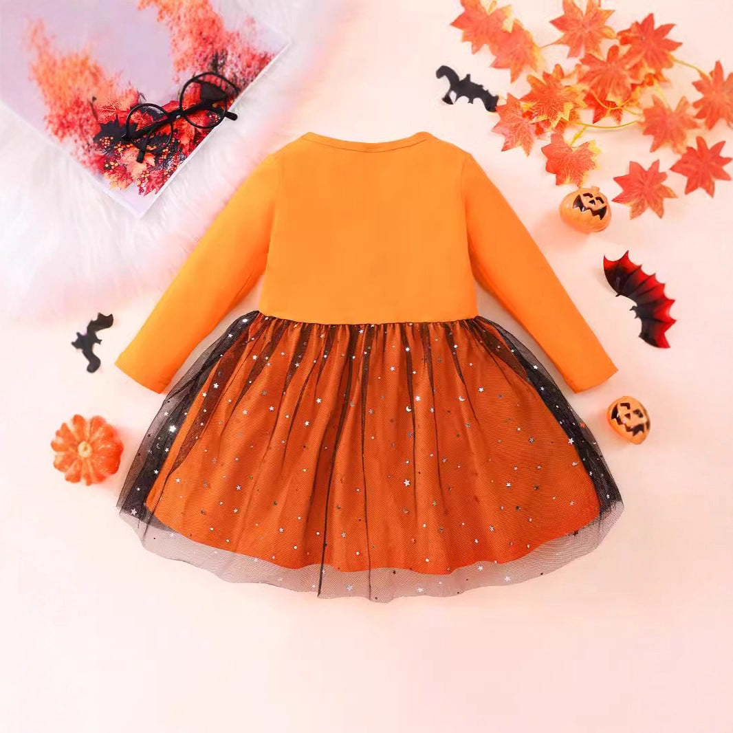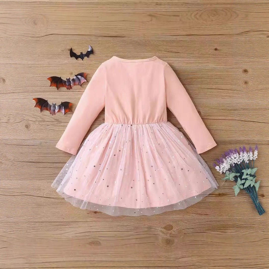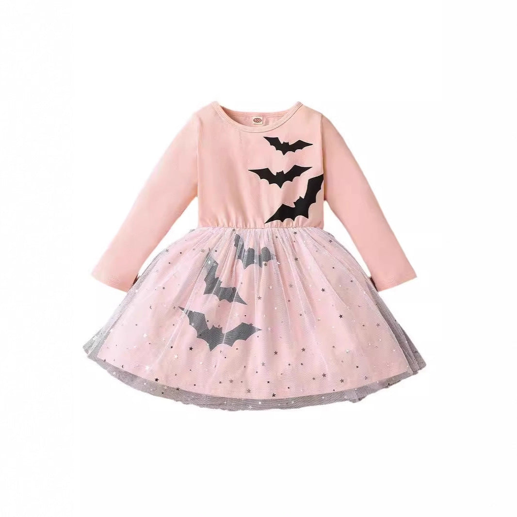 Z25091122外貿邊境萬聖節cosplay中小女童裝秋款長袖蝙蝠衫網紗裙裙擺